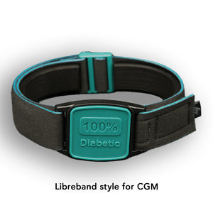 Armband with black neoprene strap and 100% Diabetic design on teal cover.
