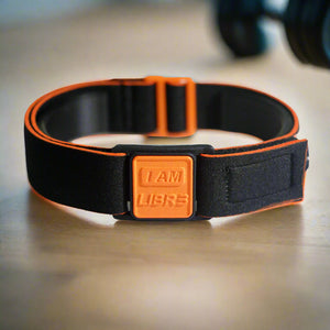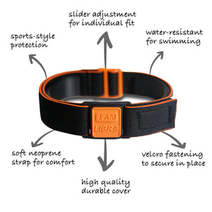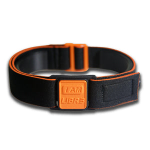 Libreband for FreeStyle Libre 3 CGM with Special Edition I AM LIBR3 wording on orange cover with black neoprene strap.