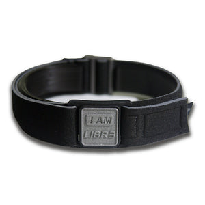 Stylish adjustable black neoprene strap with pewter coloured cover featuring I AM LIBR3 motif.