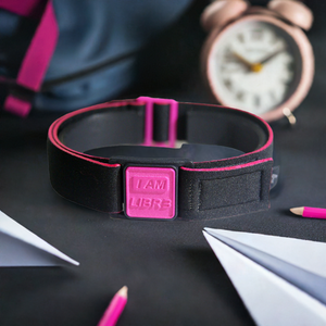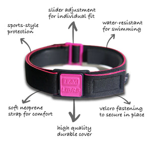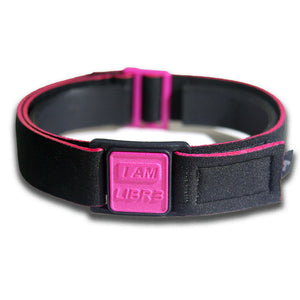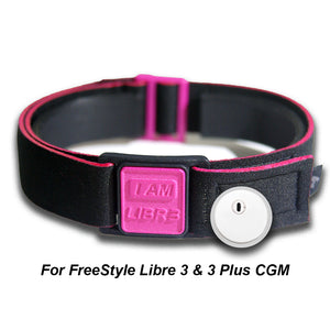 Libreband for FreeStyle Libre 3 CGM with Special Edition I AM LIBR3 wording on magenta cover with black neoprene strap.